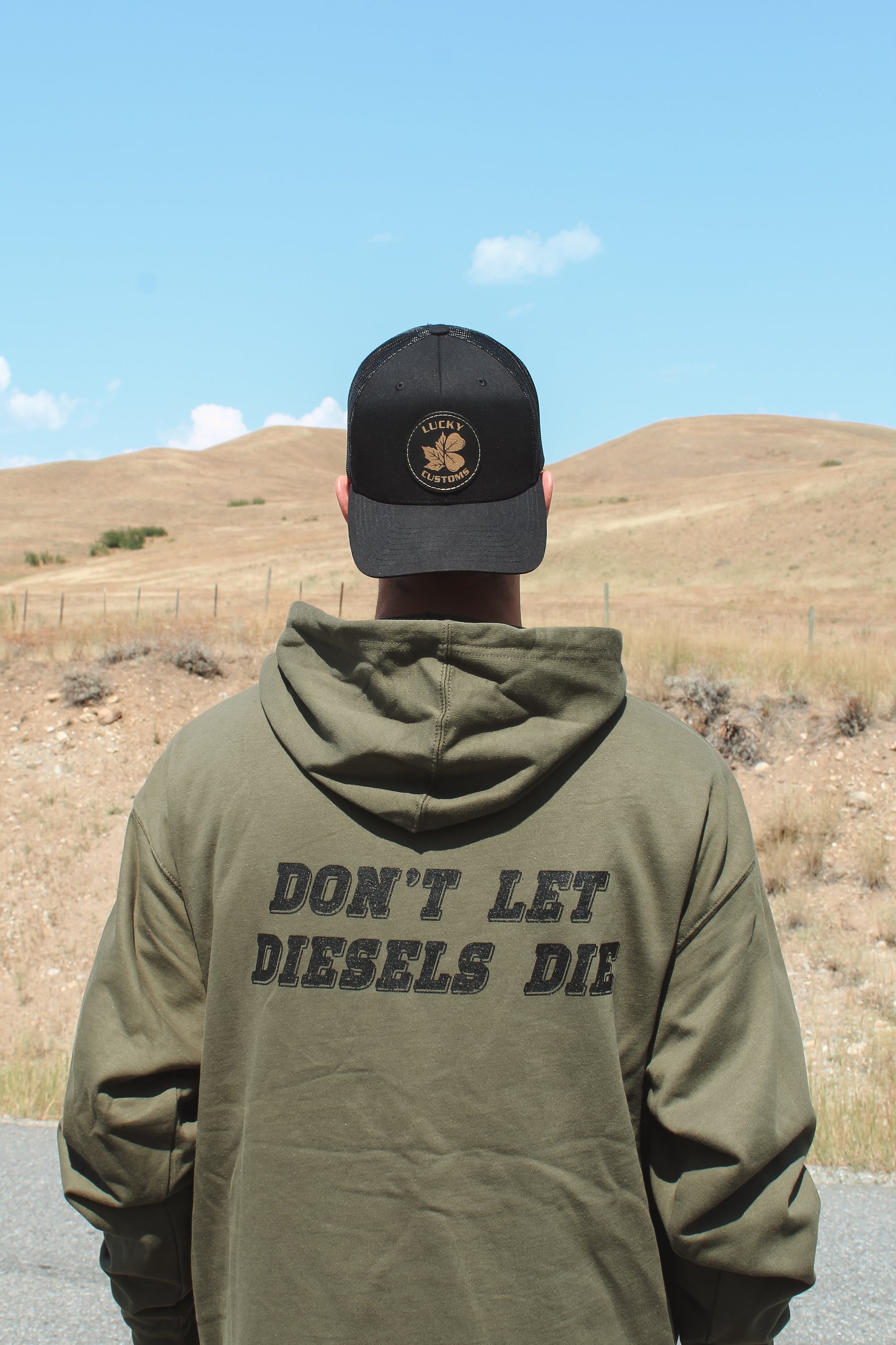 The most comfortable hoodies on the market, branded with a sleek Lucky Customs logo on the front and the slogan “Don’t Let Diesels Die” on the back. Wear this anywhere to let people know that you don’t drive an EV or a Prius.