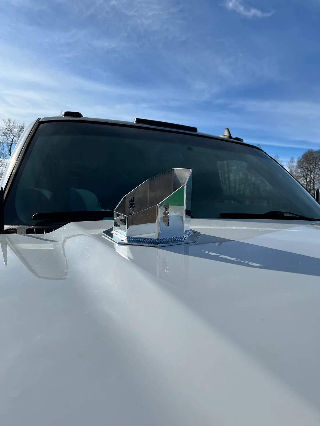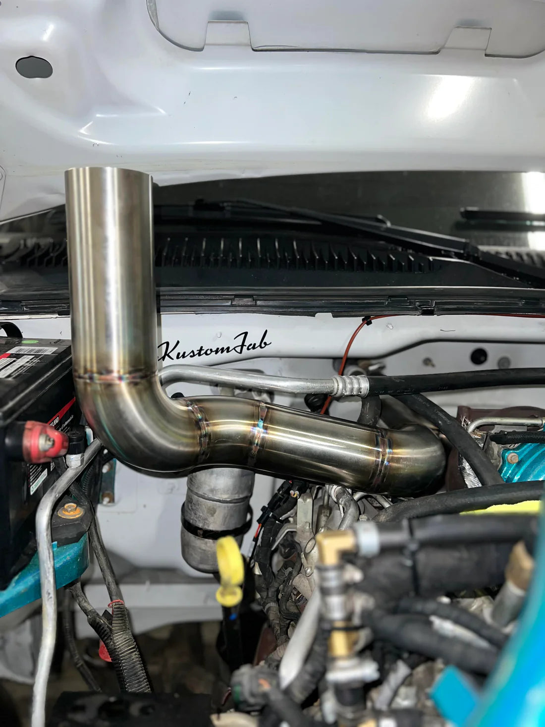 Our hoodstack has been designed to interfere with the least amount of components as possible. Majority of LLY/LBZ hoodstacks come forward by the Transmission dipstick, rubbing on that dipstick, sitting very close to the intake and exiting very close to the wiper cowl. Our hoodstack kit comes forward where the stock EGR components used to sit and runs parallel with the upper AC line. This allows us to have smoother bends, less interference with stock components and a much better exit location from the hood.