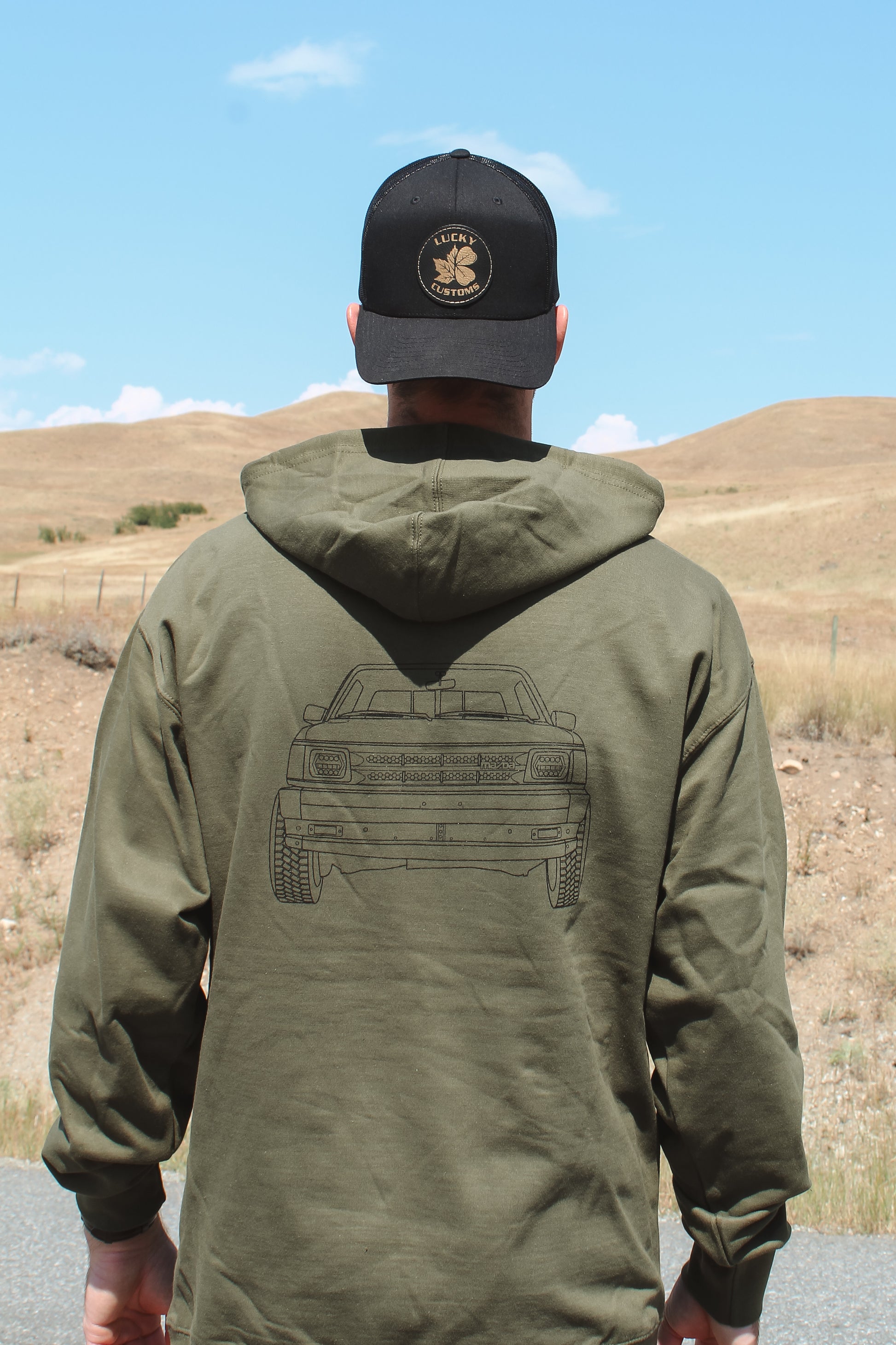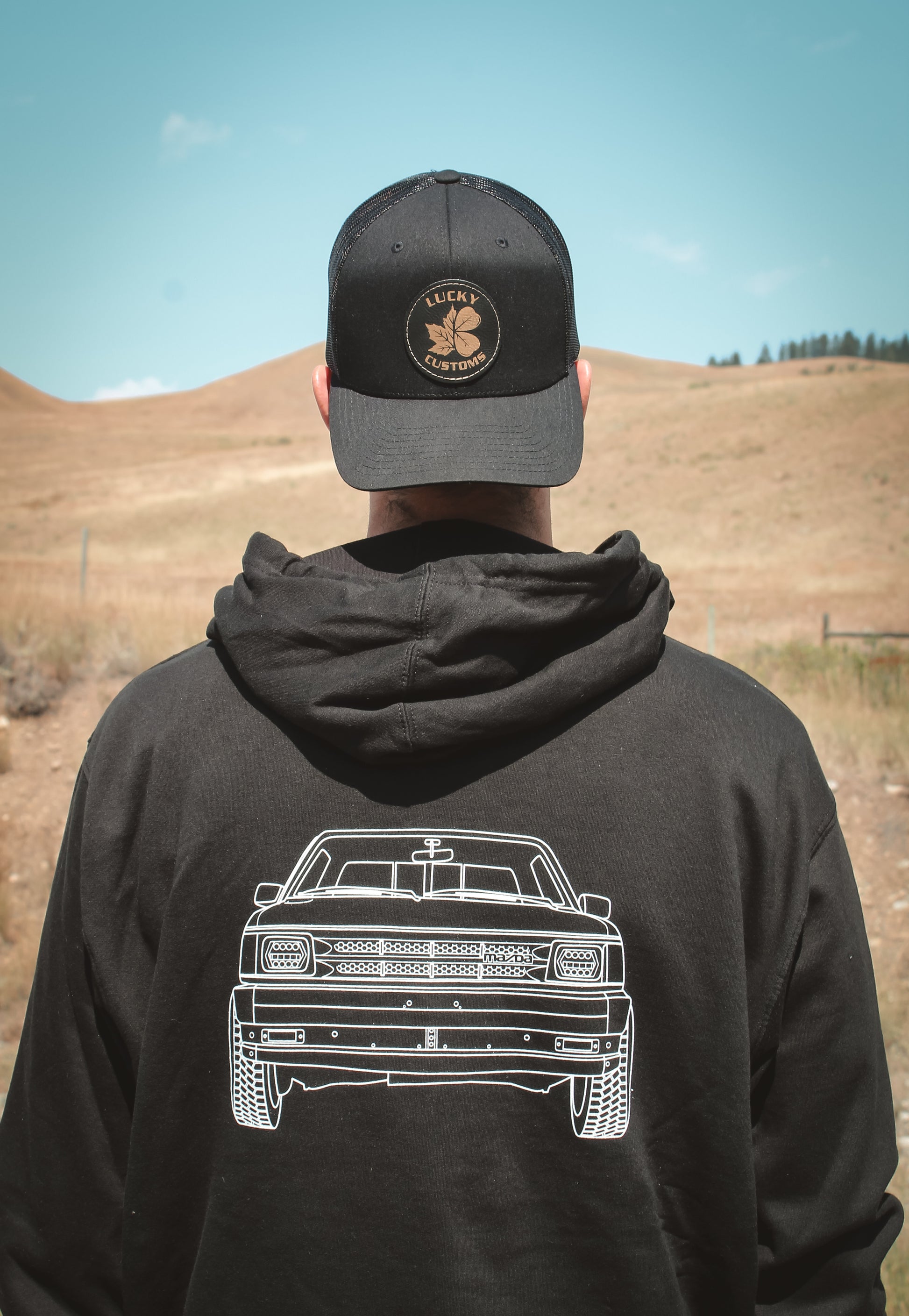 Part of our new collectors series, this hoodie includes line-art of the '87 Mazda B2200 built under the Lucky brand. It also has a sleek Lucky Customs logo placed over the heart on the front of the shirt and "Lucky Crew" printed on the left cuff. These hoodies are medium duty and comfortable to wear throughout all seasons.